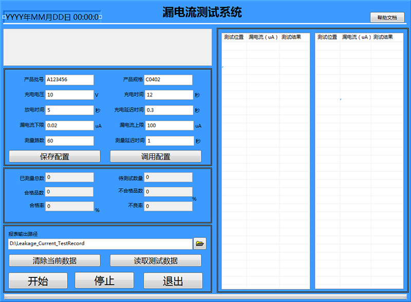 3)軟件主要功能:實現(xiàn)開關(guān)自動切換,自動對電容進行充放電,以及漏電流測試,自動將產(chǎn)品批號,產(chǎn)品規(guī)格以及測試數(shù)據(jù)寫入測試報表中(excel或txt文本文件),實現(xiàn)測試記錄可追溯,測試參數(shù)設(shè)置保存,調(diào)用,結(jié)果自動對比PASS/Fail。如需更多功能可定制。
