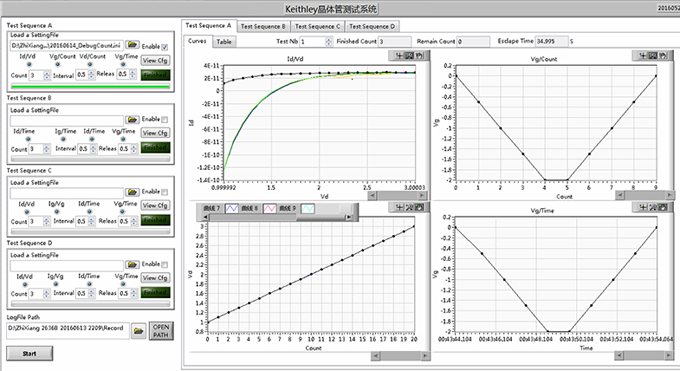 為了使測(cè)試更簡(jiǎn)單方便,配合專業(yè)的測(cè)試軟件,可以配置包括特性分析工程師快速開發(fā)完整測(cè)試系統(tǒng)所需的一切。軟件提供完整的器件特性分析,包括:曲線模式,用于測(cè)試IV曲線,提取器件參數(shù)。實(shí)時(shí)跟蹤模式,用于對(duì)器件主要參數(shù)(如擊穿電壓)進(jìn)行快速檢測(cè);組合模式,客戶可以根據(jù)需要設(shè)置測(cè)試來回掃描次數(shù),測(cè)試序列的間隔時(shí)間,可以幫助客戶無需手動(dòng)操作即可自動(dòng)長(zhǎng)時(shí)間測(cè)試器件,以達(dá)到對(duì)器件的可靠性壽命測(cè)試,4個(gè)窗口同時(shí)顯示曲線可以幫助客戶進(jìn)行曲線參數(shù)對(duì)比。更重要的是,用戶可以對(duì)全部測(cè)試源進(jìn)行完全控制,使他們能夠創(chuàng)建前所未有的更先進(jìn)測(cè)試。