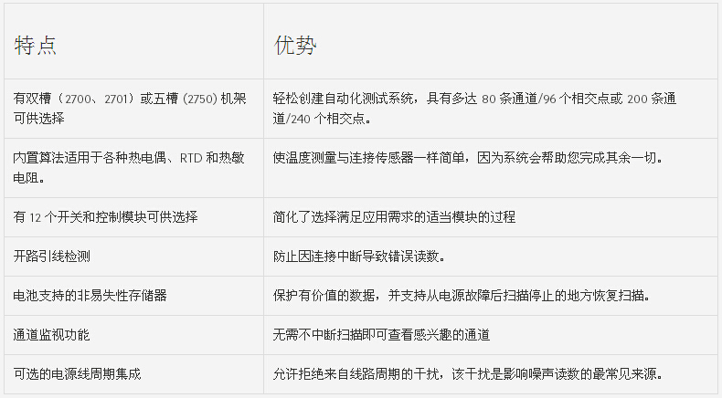 每個 2700 系列系統均將精密測量、開關和控件集于一個緊湊集成的機箱中,適用于機架安裝或臺式應用。雖然所有三個系統的核心功能和編程是相同的,但各個主機都具有獨特的功能。例如,2701 型具有 10/100BaseTX 以太網接口,2750 型具有擴展的低電阻測量功能。所有型號都與插件多路復用器、矩陣或控制模塊的同一線路兼容。
