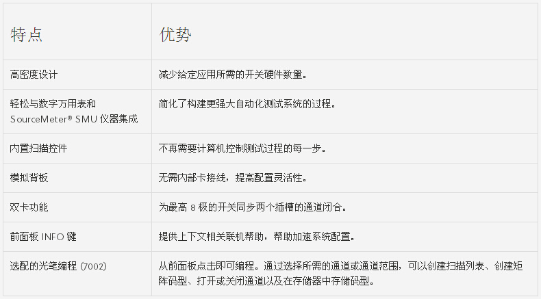 7000 系列主機支持切換直流信號,從飛安到安以及從納伏到千伏的信號均可。7001 型號是雙插槽主機,可提供多達(dá) 80 條通道的 2 極開關(guān)。10 插槽 7002 型號支持多達(dá) 400 條 2 極多路復(fù)用器通道或 400 個矩陣相交點。均具有能同時顯示主機中各通道的開/閉狀態(tài)的顯示器,其能夠簡化配置測試系統(tǒng)、進(jìn)行修改或調(diào)試現(xiàn)有程序的過程。
