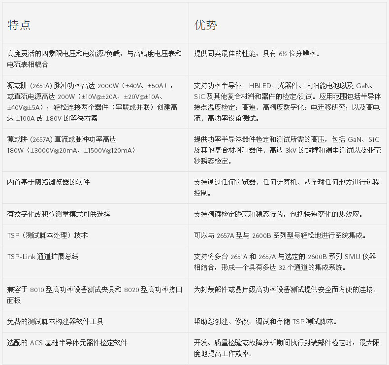 - 功率半導(dǎo)體和元器件檢定解決方案 2650 系列大功率 SourceMeter SMU 儀器專為高電壓/電流電子產(chǎn)品和功率半導(dǎo)體元件(例如,二極管、FET 和 IGBT、高亮度 LED、直流至直流轉(zhuǎn)換器、電池、太陽能電池及其他高功率材料、組件、模塊和部件)的檢定和測(cè)試而設(shè)計(jì)。 它們提供前所未有的功率、精度、速度、靈活性,且容易用于提高研發(fā)、生產(chǎn)測(cè)試和可靠性環(huán)境中的效率。 有兩種儀器可用,提供高達(dá) 3000V 或高達(dá) 2000W 的脈沖電流功率。