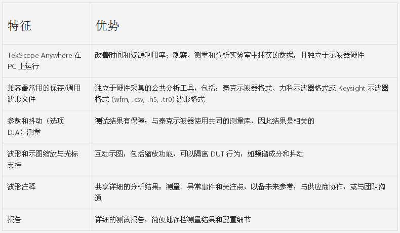 • TekScope AnywhereTM 波形分析把示波器分析環(huán)境的處理能力帶到基于 Windows 的 PC、服務(wù)器和平板中。用戶現(xiàn)在可以靈活地執(zhí)行各項(xiàng)分析任務(wù),包括在實(shí)驗(yàn)室外部進(jìn)行定時(shí)、眼圖和抖動(dòng)分析。 可以在團(tuán)隊(duì)成員和遠(yuǎn)程站點(diǎn)之間迅速共享泰克 DPO/MSO5000、DPO7000C 和 DPO/MSO70000C/D/DX 系列示波器的波形數(shù)據(jù)和設(shè)置,從而改善工作效率。